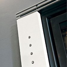 Каминная рамка из красного сериграфированного закаленного стекла с декоративными "болтами" из полированной нержавеющей стали.