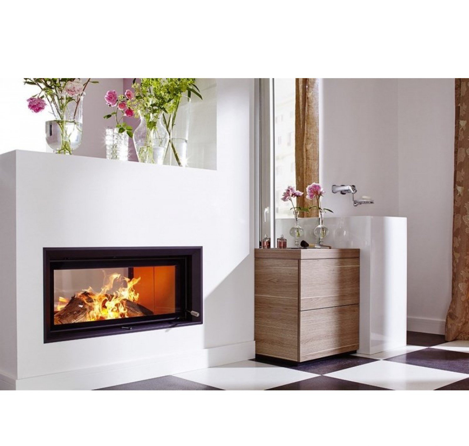 Двухсторонняя каминная топка с прямым стеклом. Топочная камера футерована шамотом. Подъёмный механизм двери (система Easy-Lift) с одной стороны. С другой стороны дверца откидывается для чистки.
